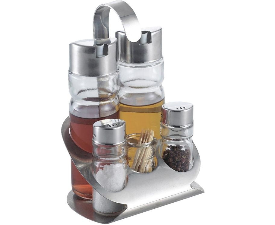 Набор для специй с ёмкостью для зубочисток, 5 предметов. Высококачественная нержавеющая сталь и стекло.