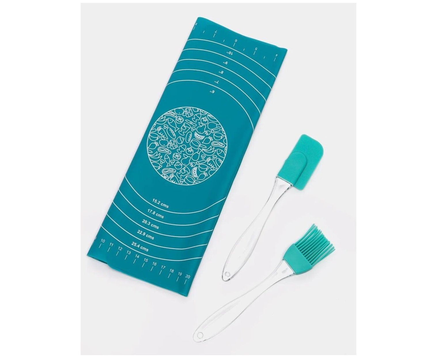 3 предмета: - кисточка (18*3 см), 13 гр- лопатка (17*3 см), 15 гр- коврик для раскатки теста однотонный, с разметкой (30*33 см, толщина 0,6 мм), 85 гр. Лопатка гибкая предназначена для равномерного распределения крема, масла, соуса или начинки. Кисточка предназначена для смазывания поверхностей посуды, а также продуктов перед запеканием или жаркой. Температура использования от -60°С до +260°С