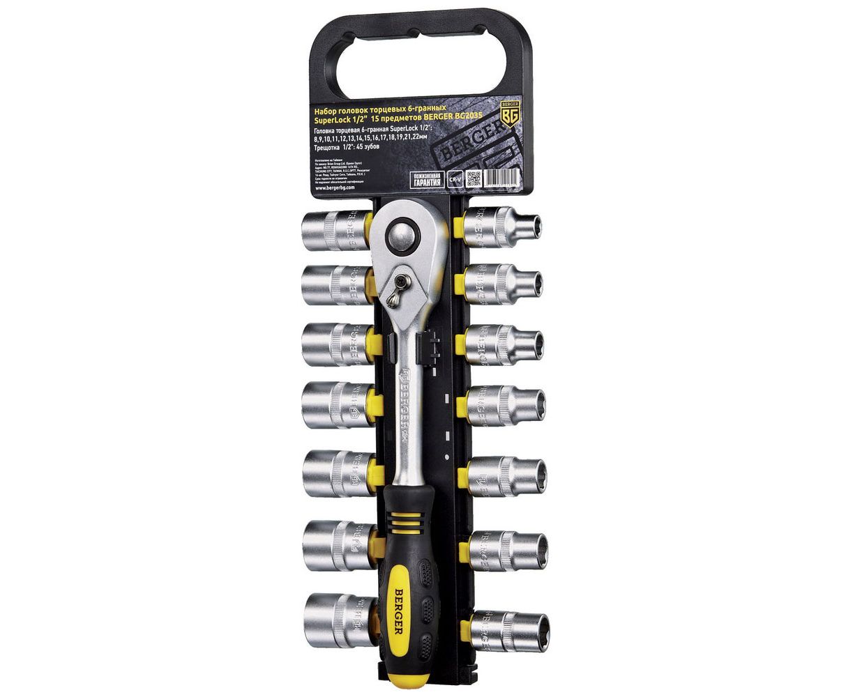 Набор головок торцевых BERGER BG2035 6-гранных SuperLock 1/2" (8-22мм) с трещоткой 1/2" 15 предметов