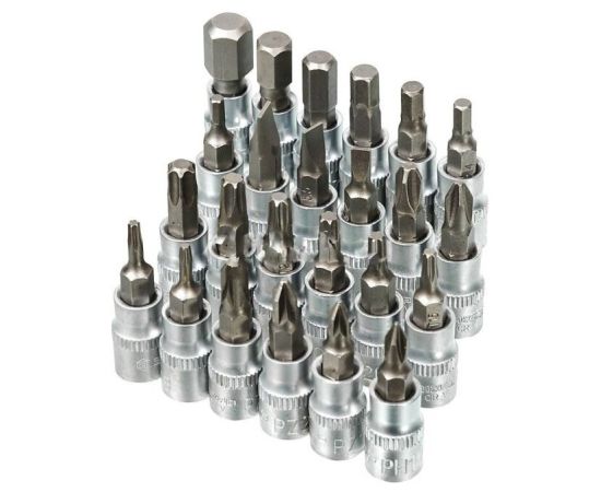 1/4": 4, 4.5, 5, 5.5, 6, 7, 8, 9, 10, 11, 12, 13, 14 мм; длинные 1/4": 6, 7, 8, 10 мм; Torx 1/4": E4, E5, E6, E7, E8, E10; с битами 1/4": Т8, T10, Т15, Т20, Т25, Т27, Т30, Т40, H3, H4, H5, H6, H7, H8, H10, SL4, SL5.5, SL6,5 PH1, PH2, PH3, PZ1, PZ2, PZ3