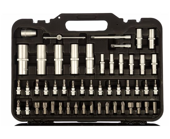 в комплекте: 1/4": трещотка (ключ трещоточный с быстрым сбросом) 45 зубов: 150 мм., вороток Т-образный: 110 мм, кардан шарнирный, удлинитель: 50, 100 мм., отвертка с присоединительным квадратом: 150 мм; 1/2": трещотка (ключ трещоточный с быстрым сбросом) 45 зубов: 260 мм., кардан шарнирный, переходник скользящий для удлинителей, удлинитель: 125, 250 мм; 5/16": адаптер для бит; тип стали инструмента: CR-V (хром-ванадий); материал ручек инструмента: резинопластик; тип стали бит: S2