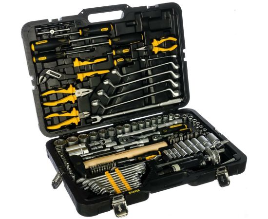 1/4" (Super Lock): 6, 7, 8, 9, 10, 11, 12 мм; длинные 1/4" (Super Lock): 8,10,12 мм; Torx 1/4": E4, E5, E6, E7, E8; трещетка 1/4": 45 зубов; вороток т-образный 1/4": 110 мм; удлинитель 1/4": 50, 100 мм; гибкий удлинитель 1/4": 150 мм; карданный шарнир 1/4"; 1/2" (Super Lock): 13, 14, 15, 16, 17, 18, 19, 20, 21, 22, 24, 25, 27, 30, 32 мм; длинные 1/2" (Super Lock): 13, 14, 17, 19, 24, 27 мм; Torx 1/2": Е10, Е11, Е12, Е14, Е16 Е18, Е20, Е22; свечные 1/2": 16, 21 мм; трещетка 1/2": 45 зубов; вороток с шарниром 1/2": 375 мм; удлинитель 1/2": 125, 250 мм; карданный шарнир 1/2"