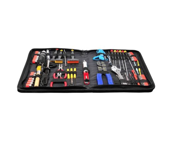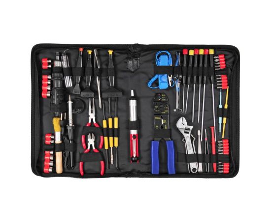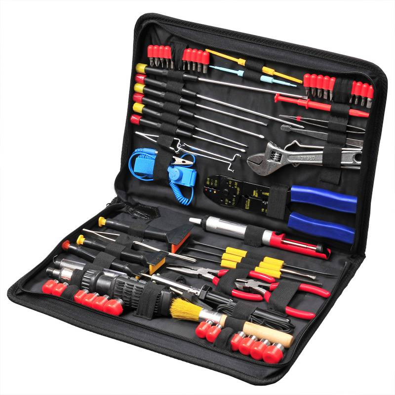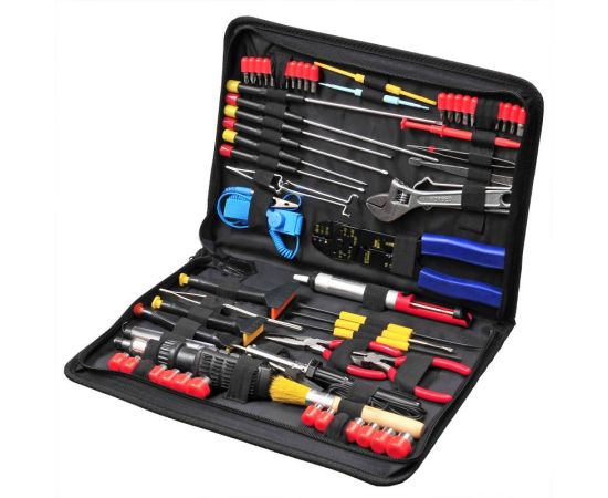 - реверсивная рукоятка для бит; адаптер-переходник для головок; инструмент для разделки кабеля; 3 инсертера для микросхем; 2 экстрактора для микросхем; паяльник; отсос; набор для пайки с флюсом; зацеп; подставка для паяльника; припой; антистатический браслет; 2 пинцета; кисточка