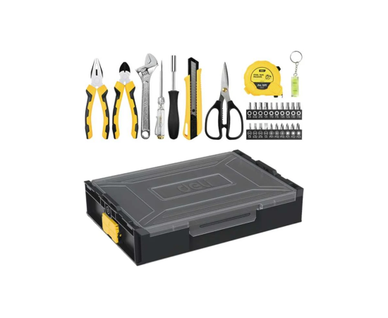 Deli DL1229 представляет собой функциональный органайзер размером 340×260×70 мм, укомплектованный высококачественным набором инструментов для комплексного решения бытовых и ремонтных задач.