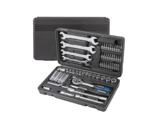 Комплектация: Набор включает в себя 62 предмета, включая торцевые головки, биты, ключи и удлинители. Это позволяет легко справляться с любыми задачами — от замены деталей до мелкого ремонта. Всё необходимое в одном комплекте!