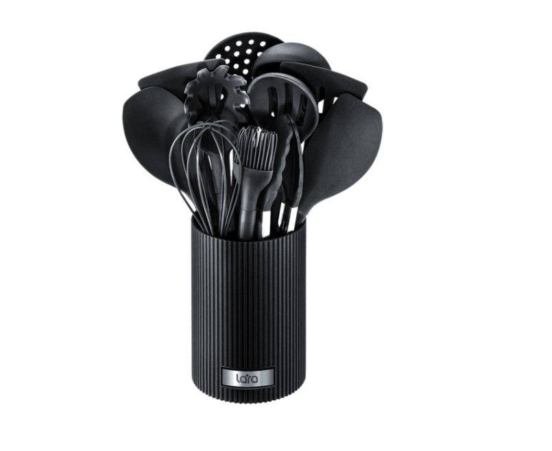 Набор кухонных принадлежностей LARA LR07-81 в черном цвете – это стильный многофункциональный комплект кухонных аксессуаров. В комплекте 11 инструментов для приготовления пищи и подставка для удобного хранения. Кухонные принадлежности из силикона обладают антипригарным покрытием, выдерживают высокие температурные нагрузки (до 220 °С) и абсолютно безвредны для здоровья. Не оставляют царапин, подходят для посуды с антипригарным покрытием. Компактный набор не займет много места на вашей кухне, подходит для повседневного использования и легко чистится. Получайте удовольствие от готовки с кухонными принадлежностями Lara!