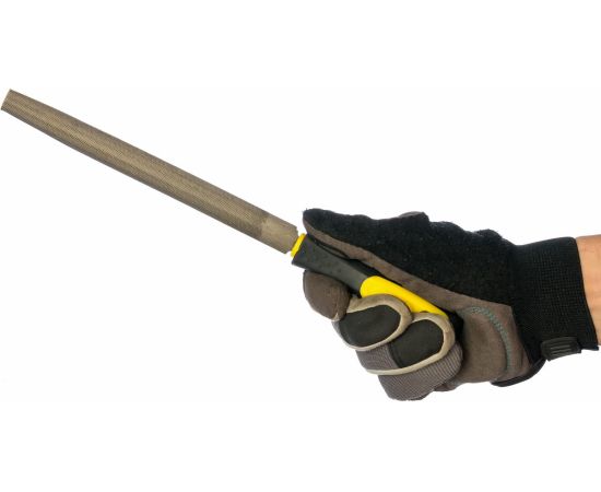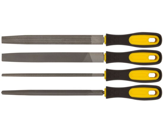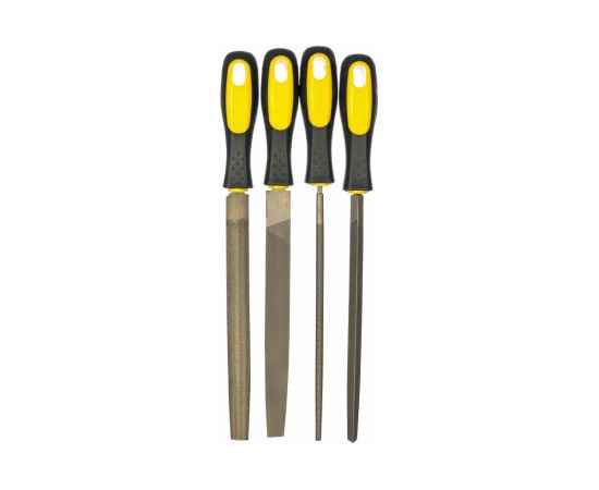 Набор напильников состоит из четырех напильников, имеющих следующие профили: трехгранный, плоский, круглый, полукруглый. Применяется для обработки различных поверхностей. Длина инструментов составляет 200 мм.