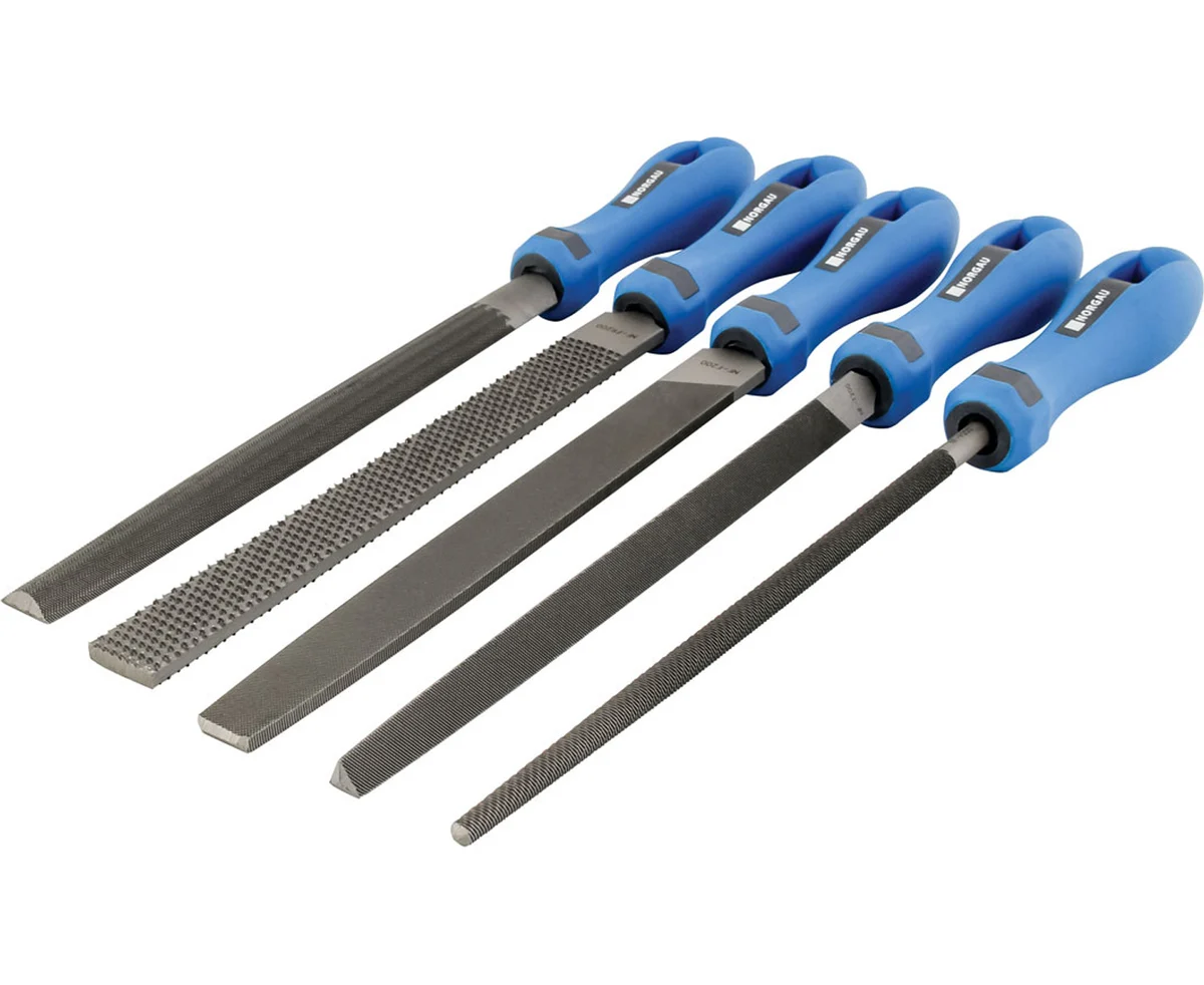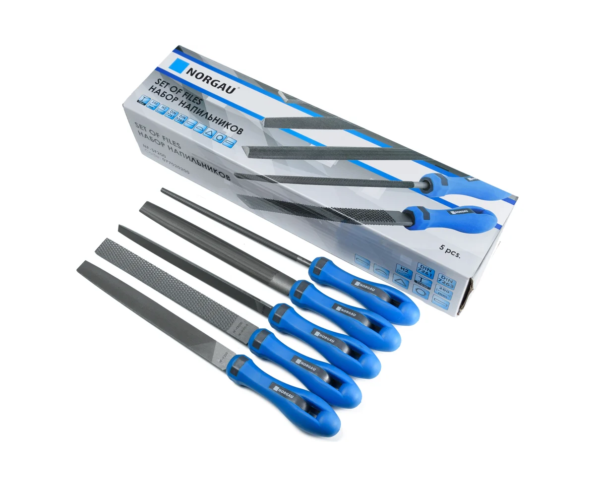 Набор напильников NORGAU NF-SF200 200мм H2, 5 предметов 077020200 предназначен для различных слесарных работ. В состав набора входит 5 напильников: плоский остроносый, трехгранный, полукруглый, круглый, плоский тупоносый. Разнообразие форм напильников поможет выполнить следующие операции: шлифование, снятие заусенцев, опиливание канавок и фасок и т.д. Напильнике в наборе с насечкой № 2 это точность 0,02-0,05 мм и снимаемый слой металла 0,02 - 0,06 мм.