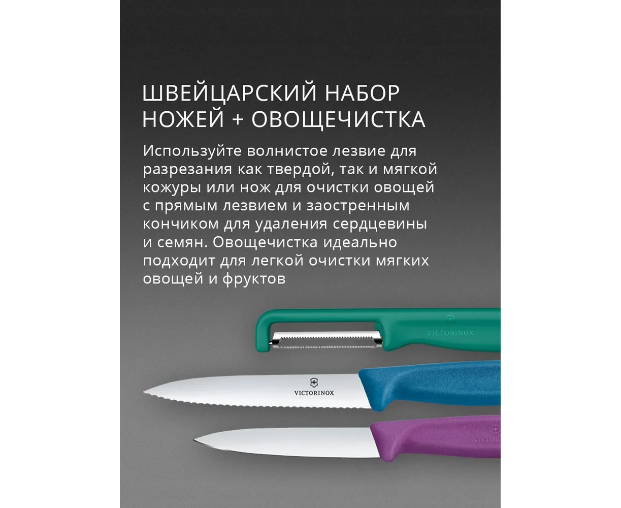 В комплекте 2 ножа фиолетового и синего цвета с прямой и серрейт заточкой, длиной лезвия 8 и 10 см, овощечистка Iota зеленого цвета c двойным лезвием и серрейт заточкой