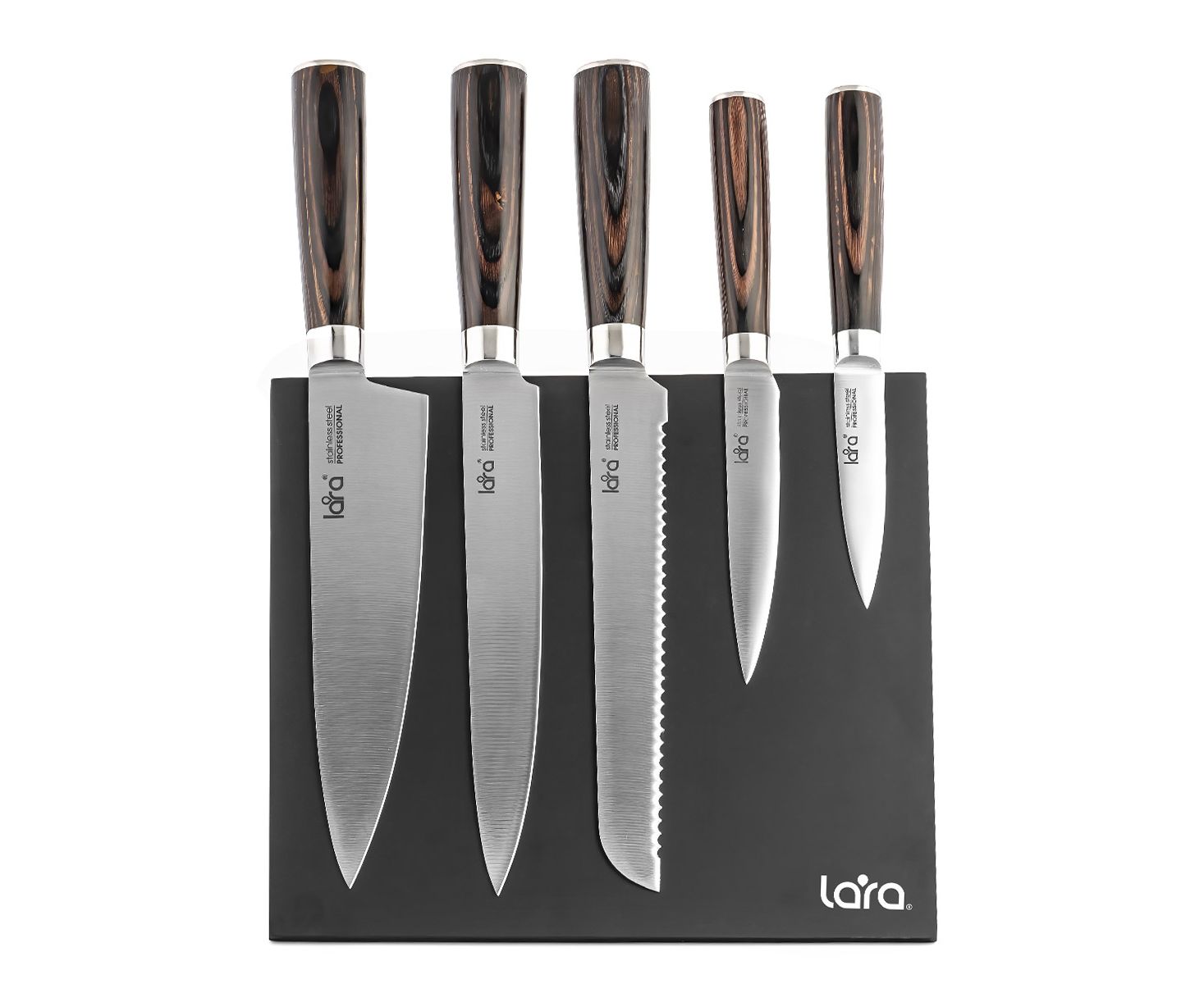 Набор ножей LARA отличается премиальным качеством исполнения. В набор входят магнитная подставка для хранения и пять ножей: для нарезки, овощей, хлеба, универсальный и поварской.