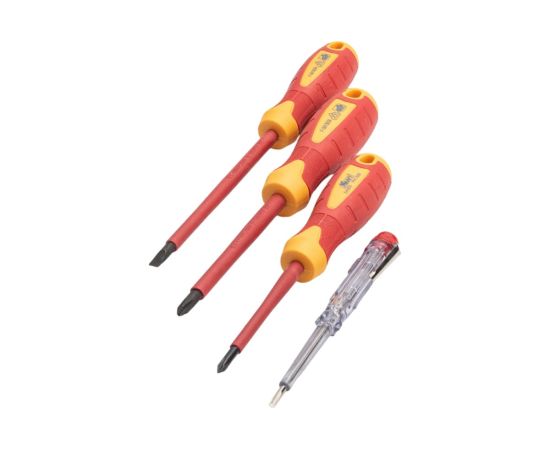 В набор отверток для электрика входят отвертки с прямым и крестовым шлицем. Удобный комплект, включающий необходимые инструменты для электрика. Состав: Индикаторная отвертка, Отвертка шлицевая SL 5.5x1.0x125, Отвертка крестовая PH1 X 80, Отвертка крестовая PH2 X 100. Хромванадиевая сталь (Cr-V), рукоятка из двухкомпонентного масло-бензостойкого пластика, диэлектрическое покрытие, которое выдерживает напряжение до 1000В.