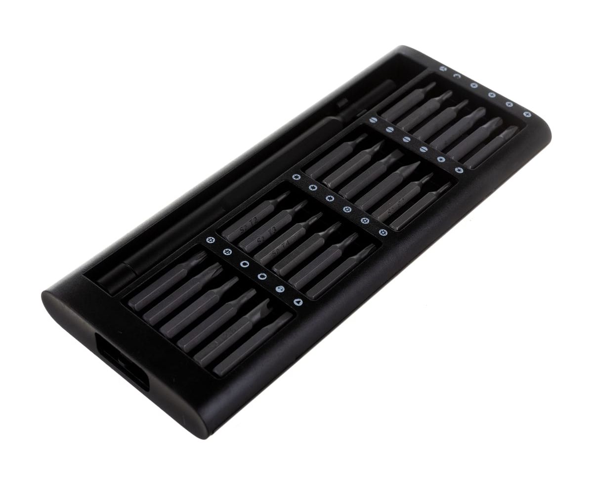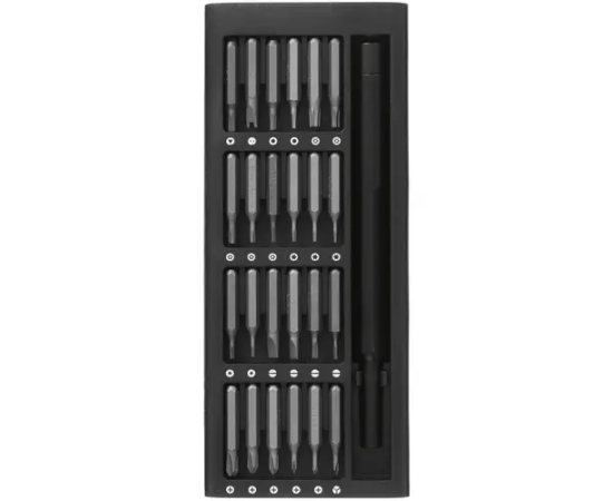 В наборе отвертка с 24 битами: 1.0, 1.5, 2.0, 2.5, 3.0, PH0, PH1, PH00, PH000, PZ0, PZ1, PZ00, T4, T5, T6, T7, T8, T9, T10, T15, H1.5, H2.0, P2, P5.