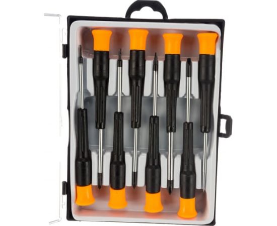 Набор отвёрток для точных работ Вихрь НОТ 8 73/6/2/12 поможет справиться с крепежом небольшого размера. Инструмент имеет тонкую длинную рукоятку и короткое жесткое жало.