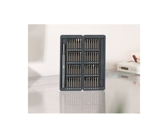 Он включает в себя саму отвертку и целых 56 бит различного типа к ней, что обеспечивает широкий выбор инструментов для разного типа винтов.