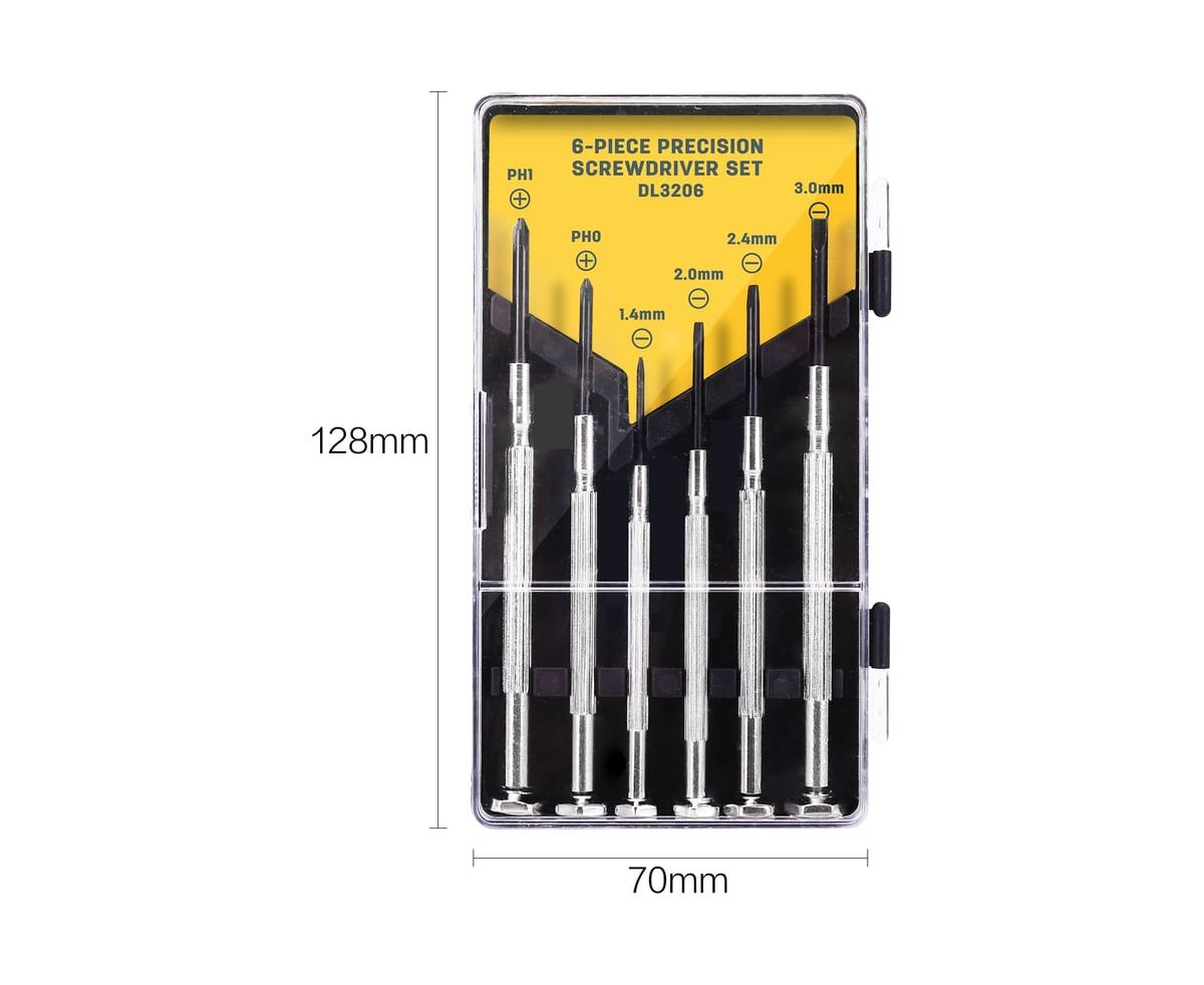 Набор прецизионных отверток DELI DL3206 6 шт. подходит для ремонта и обслуживания игрушек, часов, очков, инструментов, бытовой техники и различного прецизионного оборудования. Наконечник с антикоррозийным чёрным покрытием обеспечивает высокий контроль при работе отвертками. Вращающийся колпачок облегчает вращение крепежа. Никелированная ручка обладает антикоррозийной стойкостью и долговечностью. Отвертки изготовлены из углеродистой стали, что обеспечивает высокую прочность и надежность.