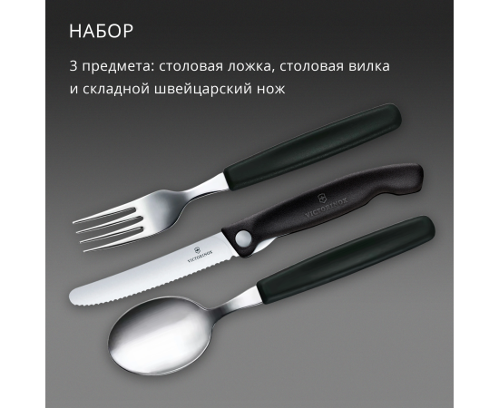 В набор Victorinox 6.7192.3F для офиса/пикника входит складной нож с серрейторной заточкой, ложка и вилка. Набор выполнен из высококачественной нержавеющей стали.