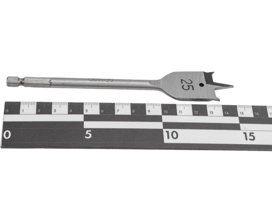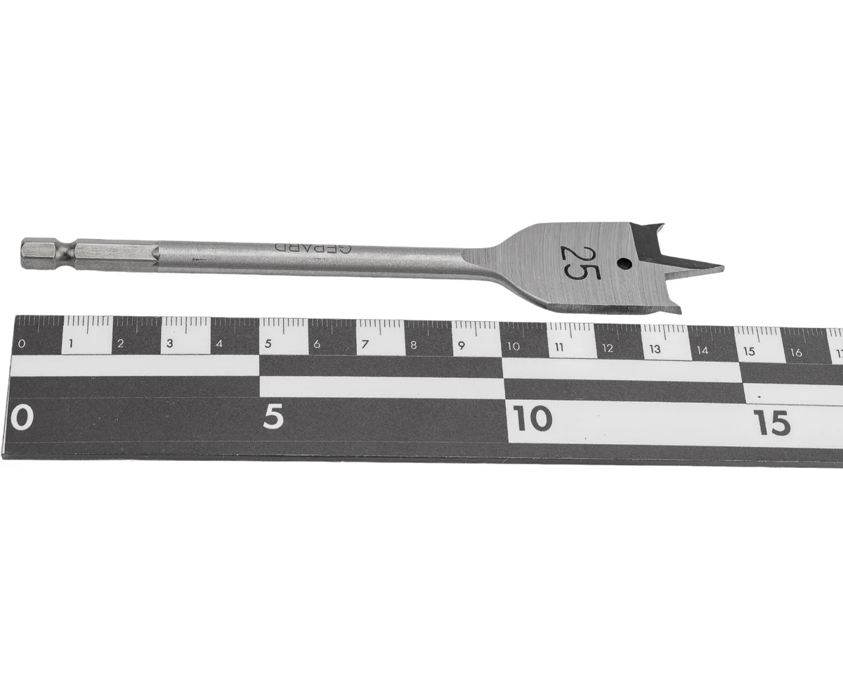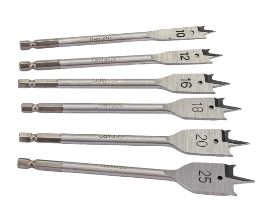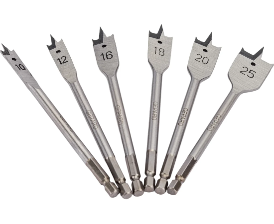 Набор сверл по дереву 6 штук GEPARD (GP0415-6) состоит из перьевых сверл длинной 152 мм . Сверла с боковыми подрезателями (зубцами). Вертикальная заточка центрирующего острия, а также заточка углубления кромки (плечевое заострение). Сверла изготовлены из высококачественной углеродистой инструментальной стали для сверления глухих и сквозных отверстий в мягкой и средней твердости древесине и легких строительных материалах, таких как гипсокартон. Надежно фиксируются в кулачковом патроне без проскальзывания. Высокая скорость сверления. Тип хвостовика шестигранный (1/4" / 6.35мм). Комплект (сверла диаметром) 10, 12, 16, 18, 20, 25 мм.
