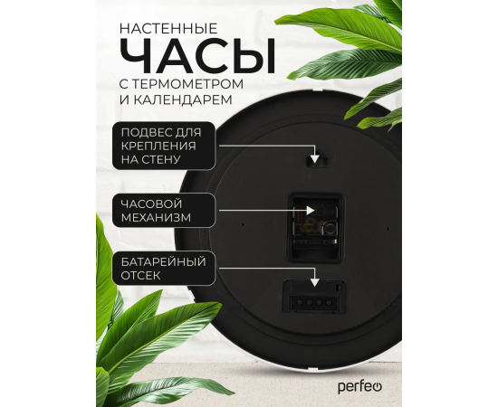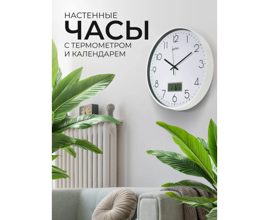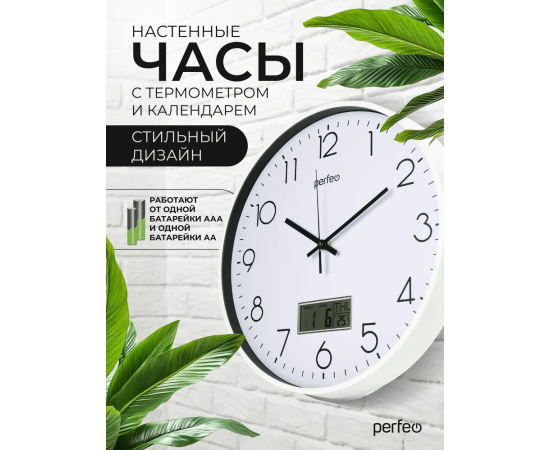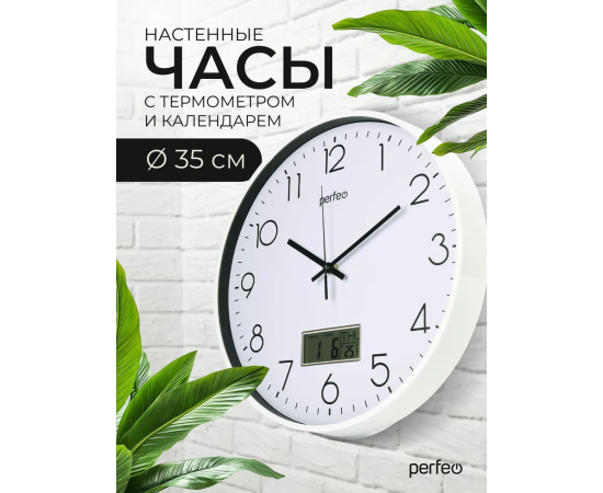 Настенные часы Perfeo "PF-WC-024"(С1), круг. 35 см, с темп и кален. белый корпус / белый циферблат