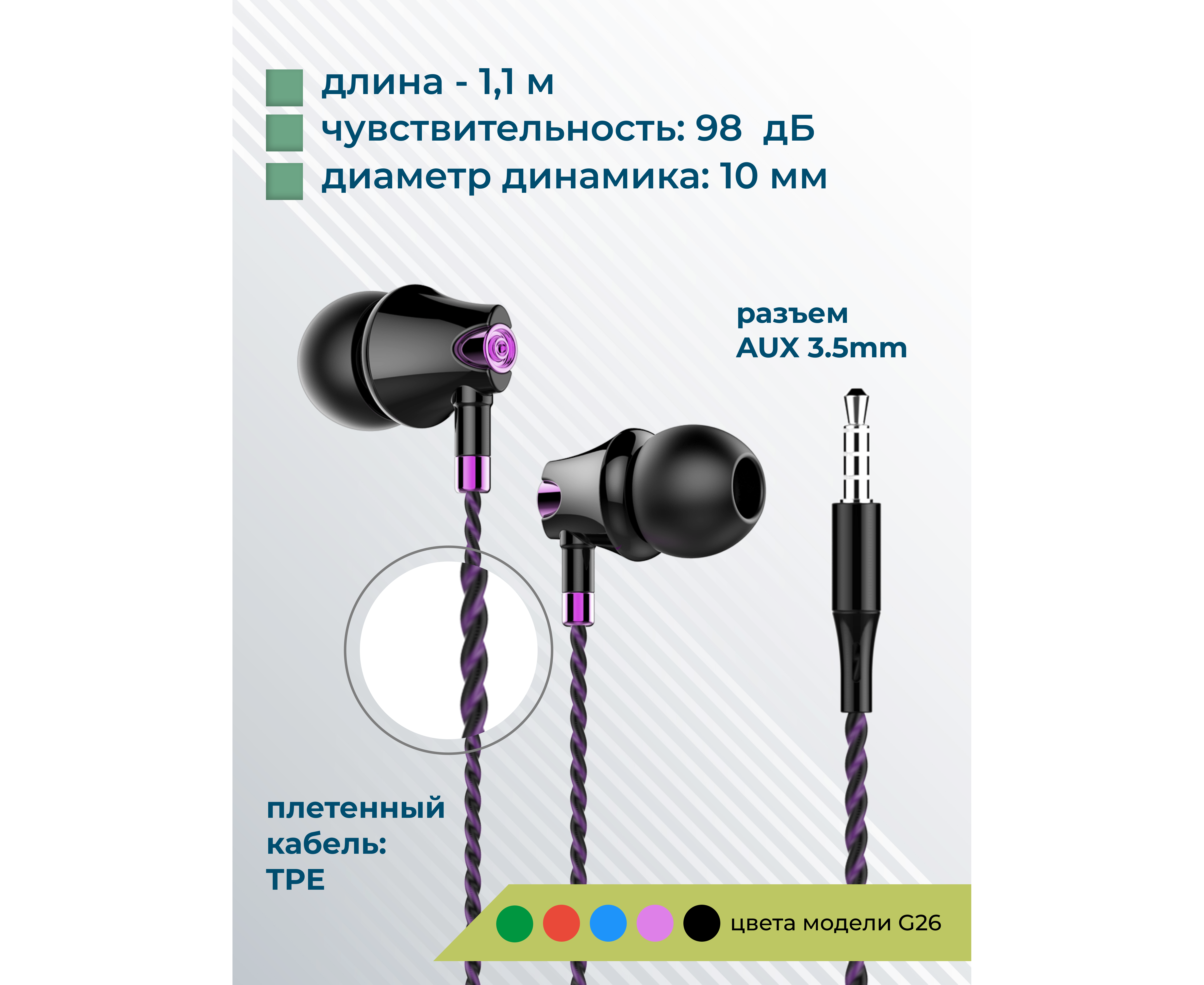 Материал: ABS-пластик, TPE, алюминиевый сплав Тип наушников: вакуумные, проводные Динамик: 10 мм Разъём: miniJack 3,5 мм Длина кабеля: 1,1 м Пульт ДУ: микрофон, старт/пауза, ответ на звонок Комплектация: наушники, сменные амбушюры, две пылезащитные заглушки для разъема AUX, кольцо-держатель для смартфона, буклет. Цвета: Black, Purple, Blue, Red, Green