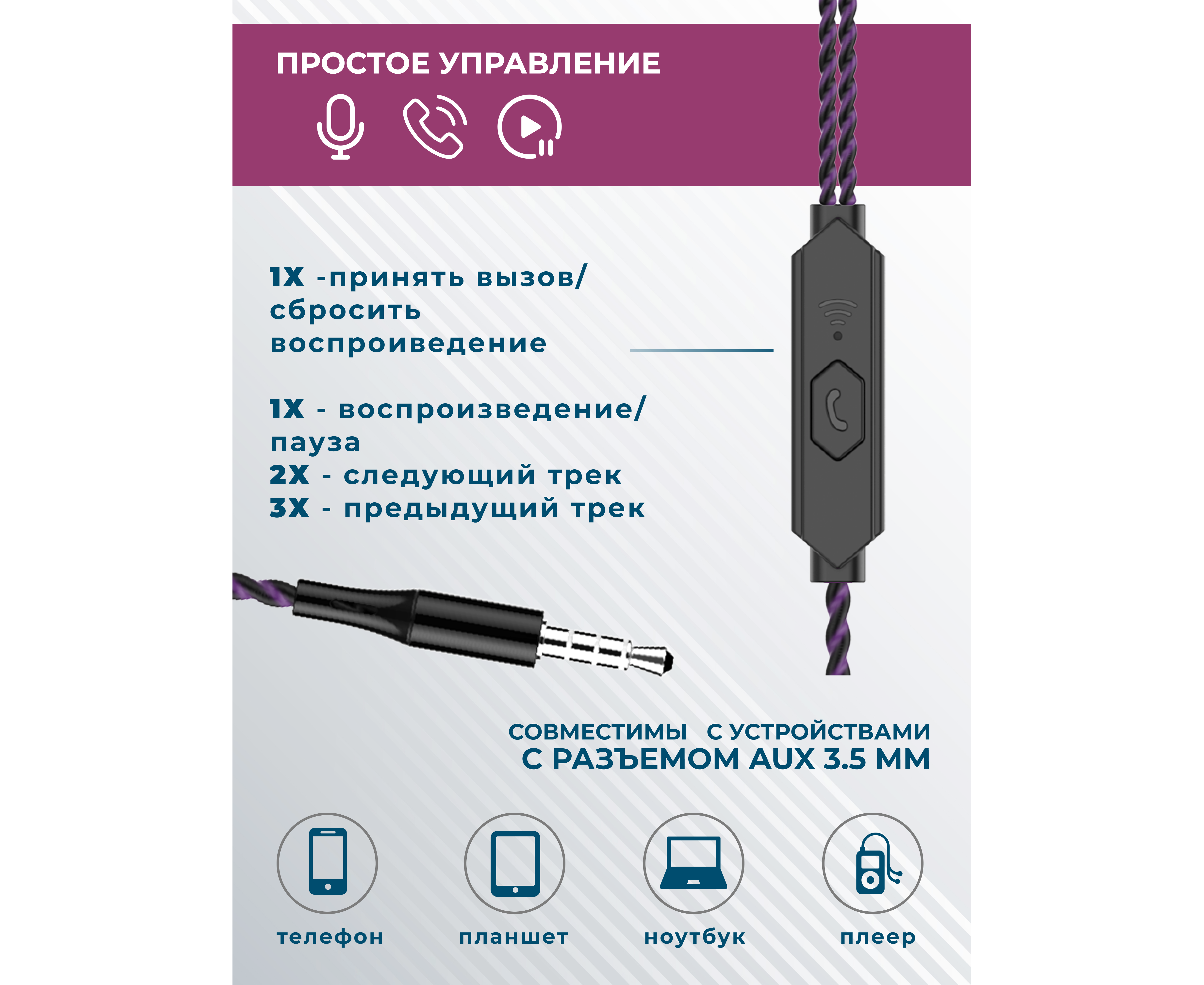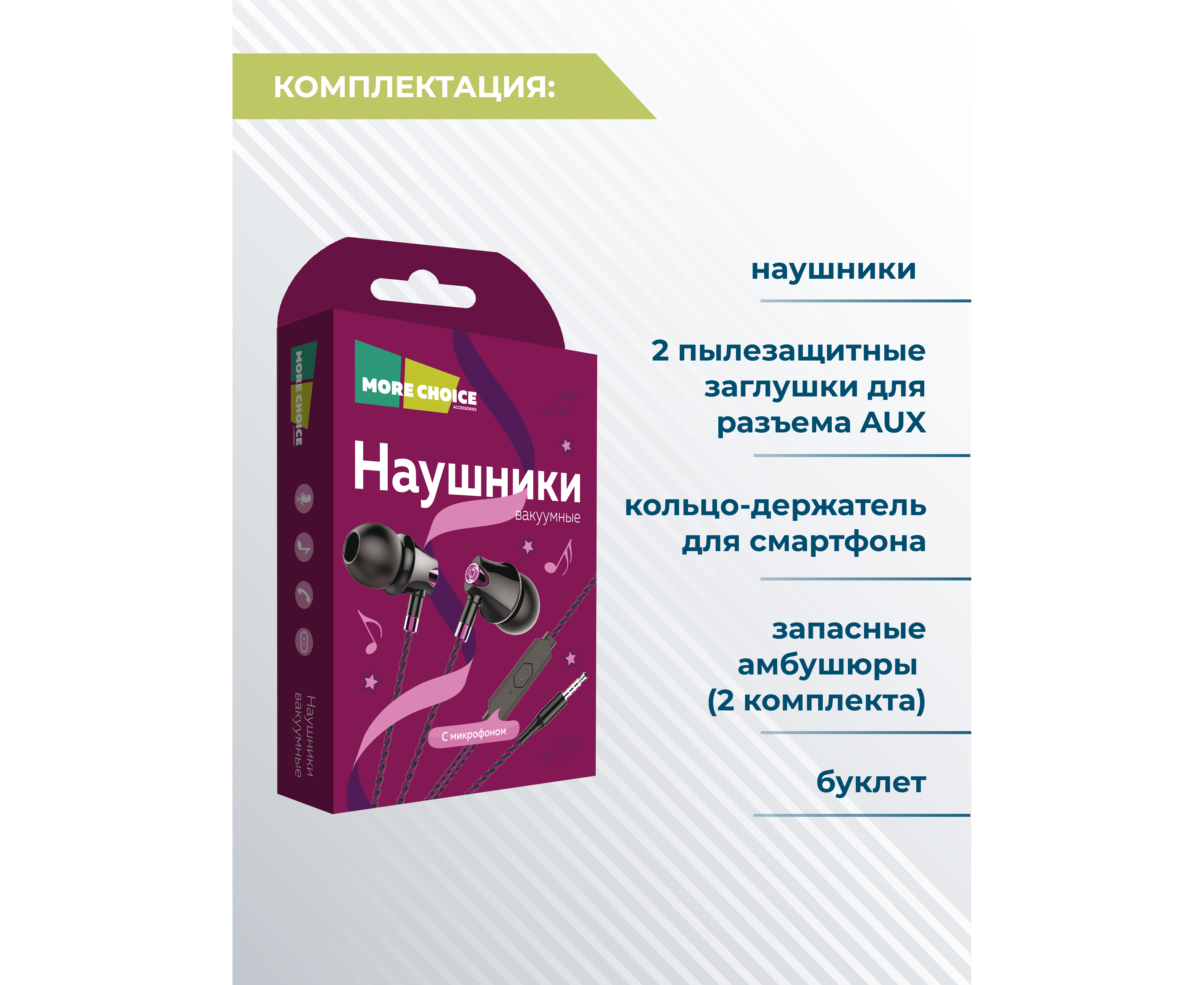 Наушники вакуумные AUX разъём с МК без рег.громкости длина 1.1м More Choice G26 (Purple)