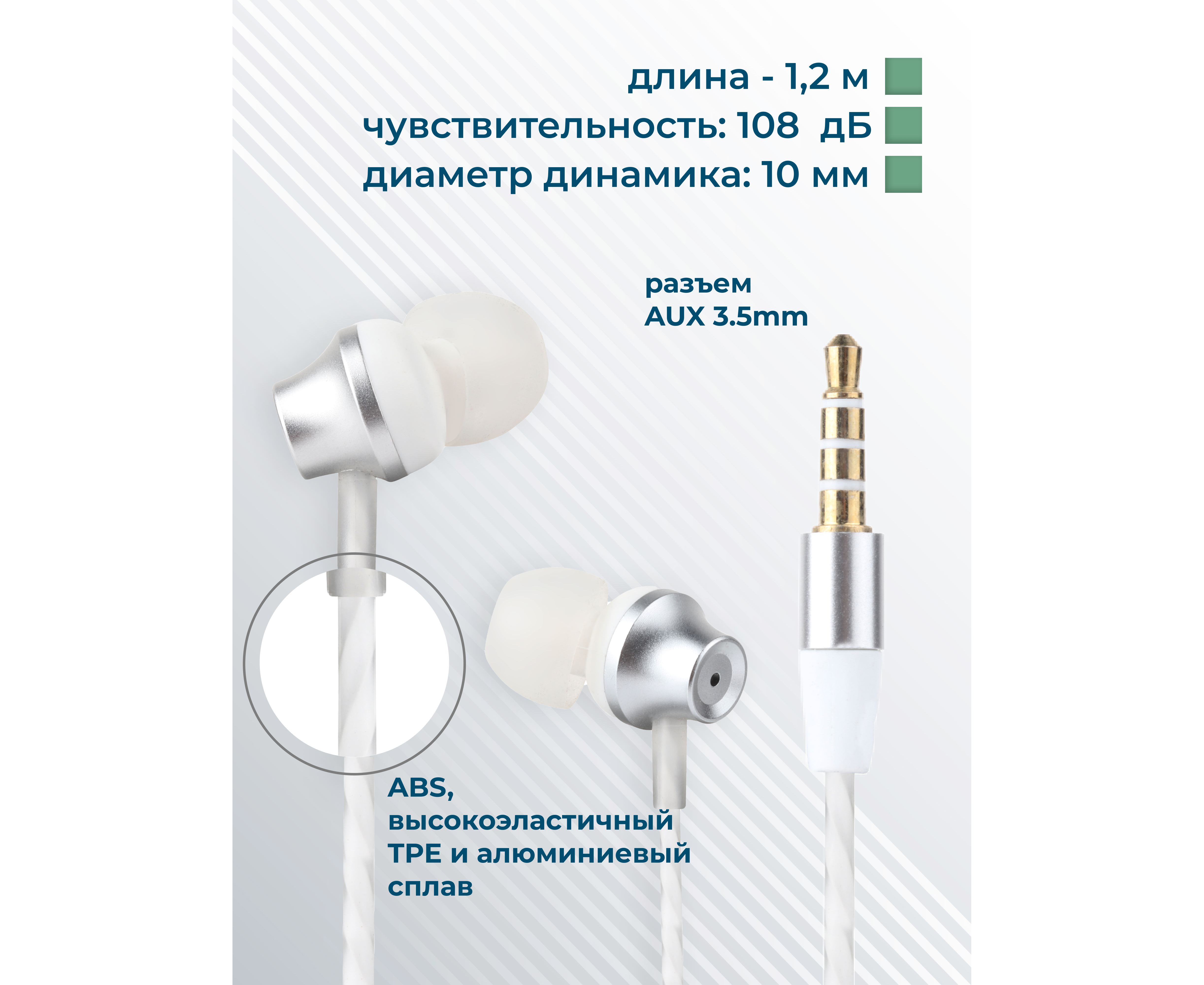 Материал: ABS-пластик, TPE, алюминиевый сплав Тип наушников: вакуумные, проводные Динамик: 10 мм Разъём: miniJack 3,5 мм Длина кабеля: 1,2 м Пульт ДУ: микрофон, регулировка громкости, старт/пауза, ответ на звонок, селфи Комплектация: наушники, две пылезащитные заглушки для разъема AUX, кольцо-держатель для смартфона, буклет. Цвета: Black, Dark Silver
