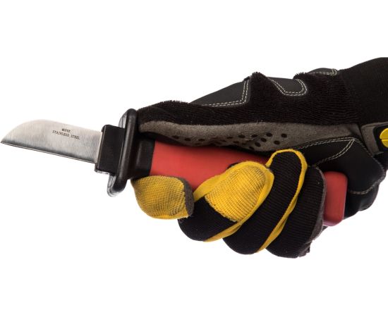 Изолированный нож FIT 1000 В, нерж.сталь, лезвие 50мм, прорезин.ручка 10605 служит для зачистки изоляционной оболочки проводов и кабелей. Изделие защищает пользователя от поражения электрическим током при выполнении работ на установках под напряжением до 1000В переменного тока и до 1500В - постоянного тока. Лезвие ножа изготовлено из нержавеющей стали, рукоятка выполнена из пластика и имеет обрезиненную поверхностность. Пластиковые ножны защищают лезвие при хранении и транспортировке.