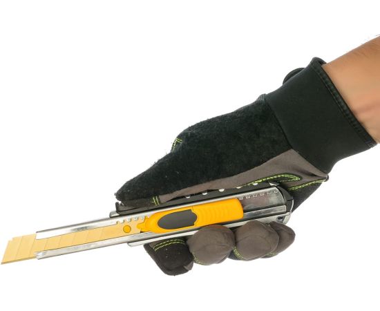 Надежный металлический корпус выдерживает значительное усилие и позволяет без труда резать линолеум.