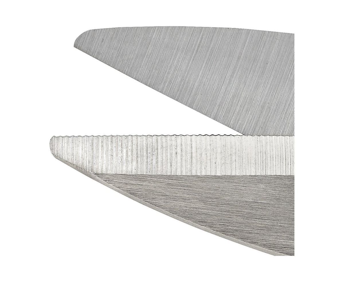 Режущие кромки инструмента заточены от основания до кончика, чтобы обеспечить чистый срез по всей длине. Лезвия изготовлены из нержавеющей стали и имеют специальную серрейторную заточку, что исключает соскальзывания материала при работе. Закругленной кончик лезвия повышает безопасность при использовании.