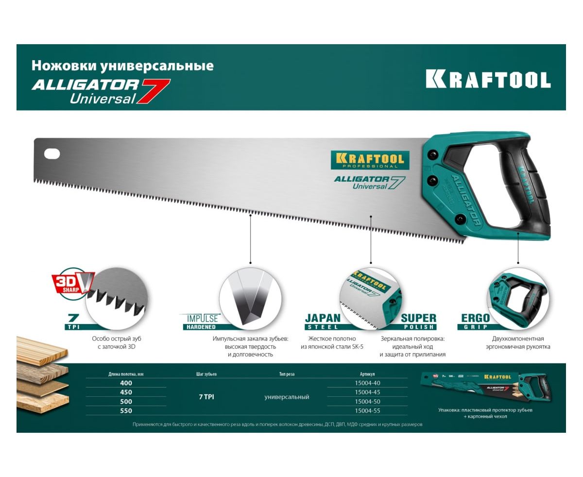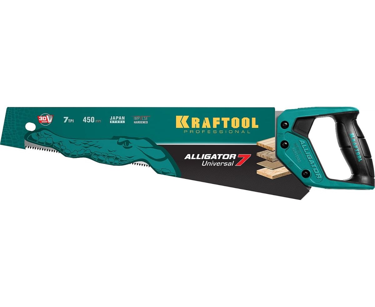 Ножовка KRAFTOOL Alligator 7 15004-45 z01 универсальная 450 мм, 7 TPI 3D зуб