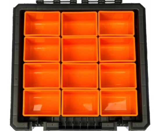 Органайзер с отделениями, 40x40x12см NEO 84-130 - универсальное приспособление для мастерской или гаража. Модель изготовлена из пластмассы и металла и оснащается противоударными уголками, что обеспечивает надежность во время транспортировки. Алюминиевые замки препятствуют случайному выпаданию крепежа во время транспортировки. Крышка органайзера выполнена из поликарбоната.