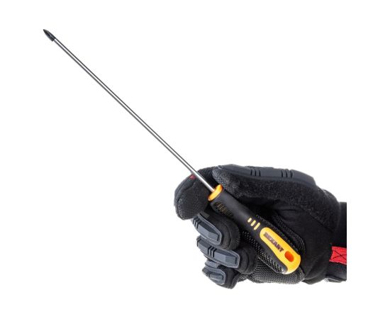 Отвертка обладает эргономичной двухкомпонентной рукояткой, которая предотвращает скольжение в ладони и обеспечивает более комфортную работу. В основании изделия предусмотрено отверстие для его подвеса.