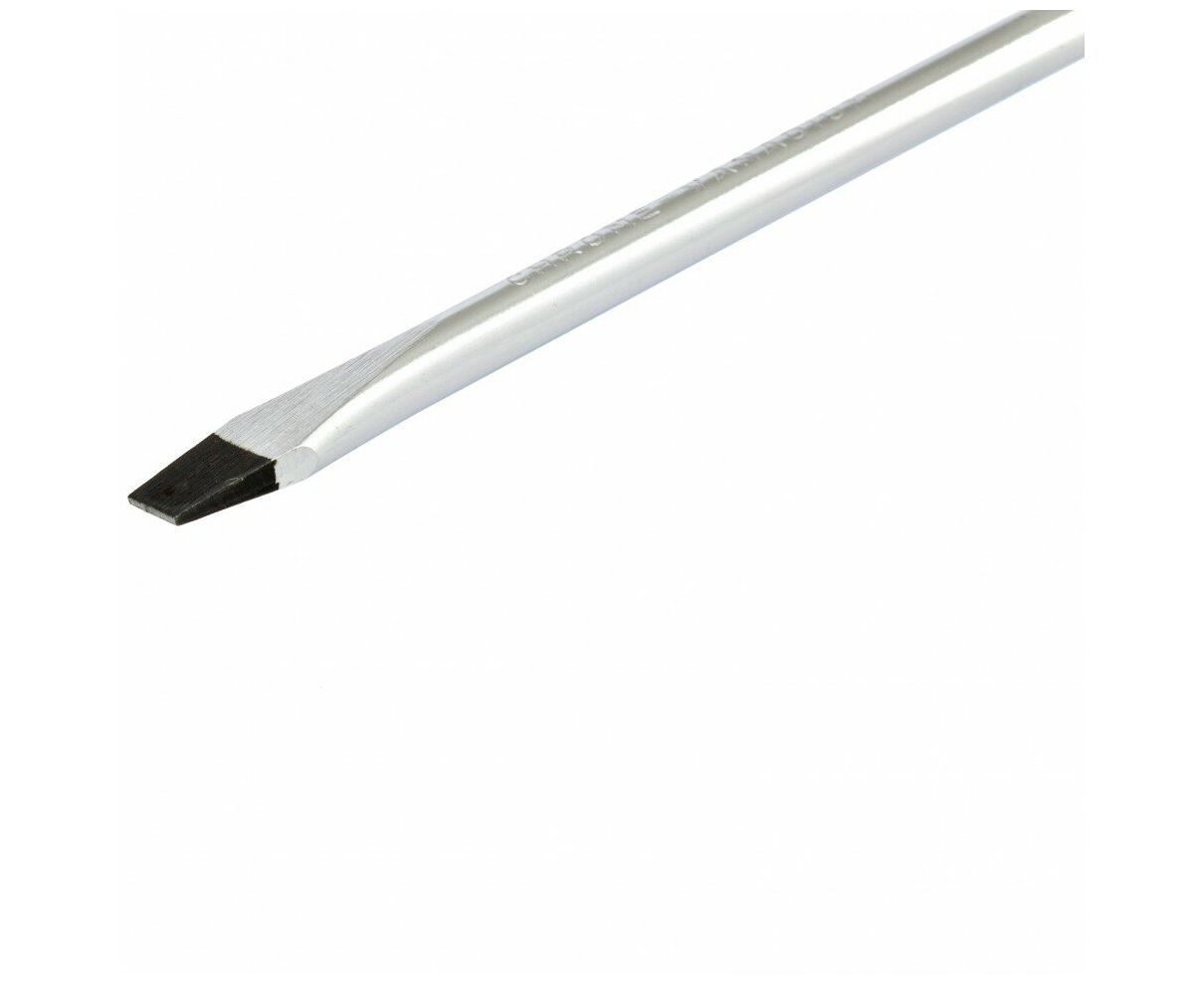 Отвертка применяется для откручивания/закручивания винтовых соединений, где используется профиль - прямой шлиц. Инструмент оснащен удобной трехкомпонентной ручкой, не позволяющей отвертке выскользнуть из рук, а также прочным стержнем из легированной хромованадиевой стали, которая увеличивает рабочий ресурс изделия.