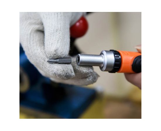 Реверсивная отвертка с набором бит поставляется в пластиковом кейсе. Инструмент обладает храповой конструкцией и эргономичной ручкой с удобным захватом, что способствует комфортной работе при монтаже и демонтаже резьбовых соединений.
