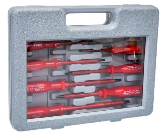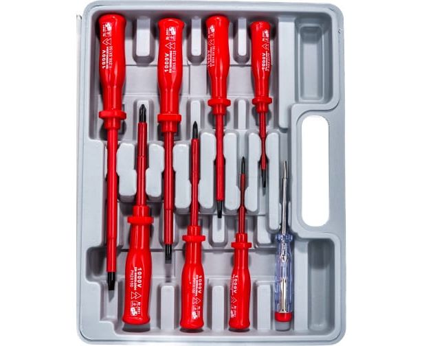Все компоненты из набора изолированных отверток имеют диэлектрическое покрытие для работы под напряжением до 1000В.