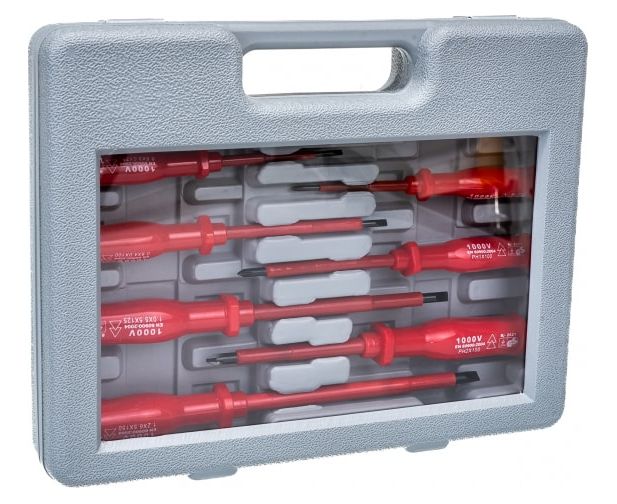 Набор изолированных отверток применяется для монтажа различных резьбовых соединений. В комплект входит семь диэлектрических отверток с наконечниками типа PH и SL, и одна отвертка для работ под напряжением до 220 В. Каждый предмет имеет удобную рукоятку. Для удобного хранения отверток, набор комплектуется пластиковым чемоданом.