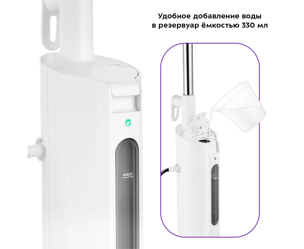 Резервуар для воды имеет ёмкость 330 мл. Такого объёма хватает примерно на 16 мин уборки. Мерным стаканчиком удобно заливать воду в резервуар. Мигание индикатора указывает на нагрев воды. Когда устройство готово к работе, индикатор горит непрерывно.
