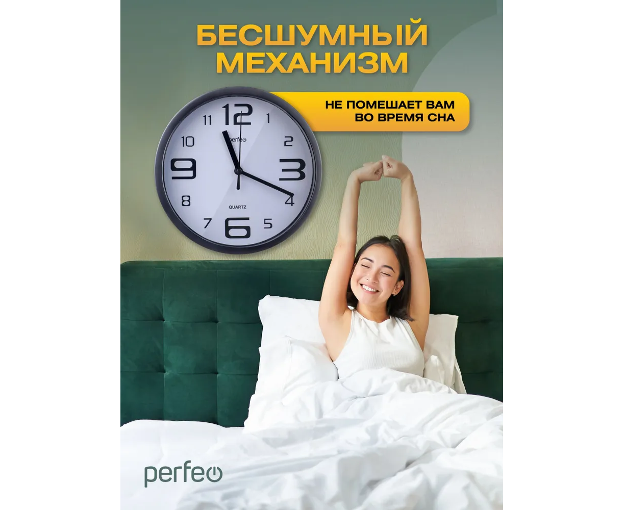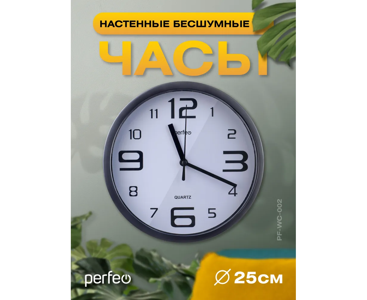 Настенные часы Perfeo "PF-WC-002"(С1), круглые д. 25 см, чёрный корпус / белый циферблат