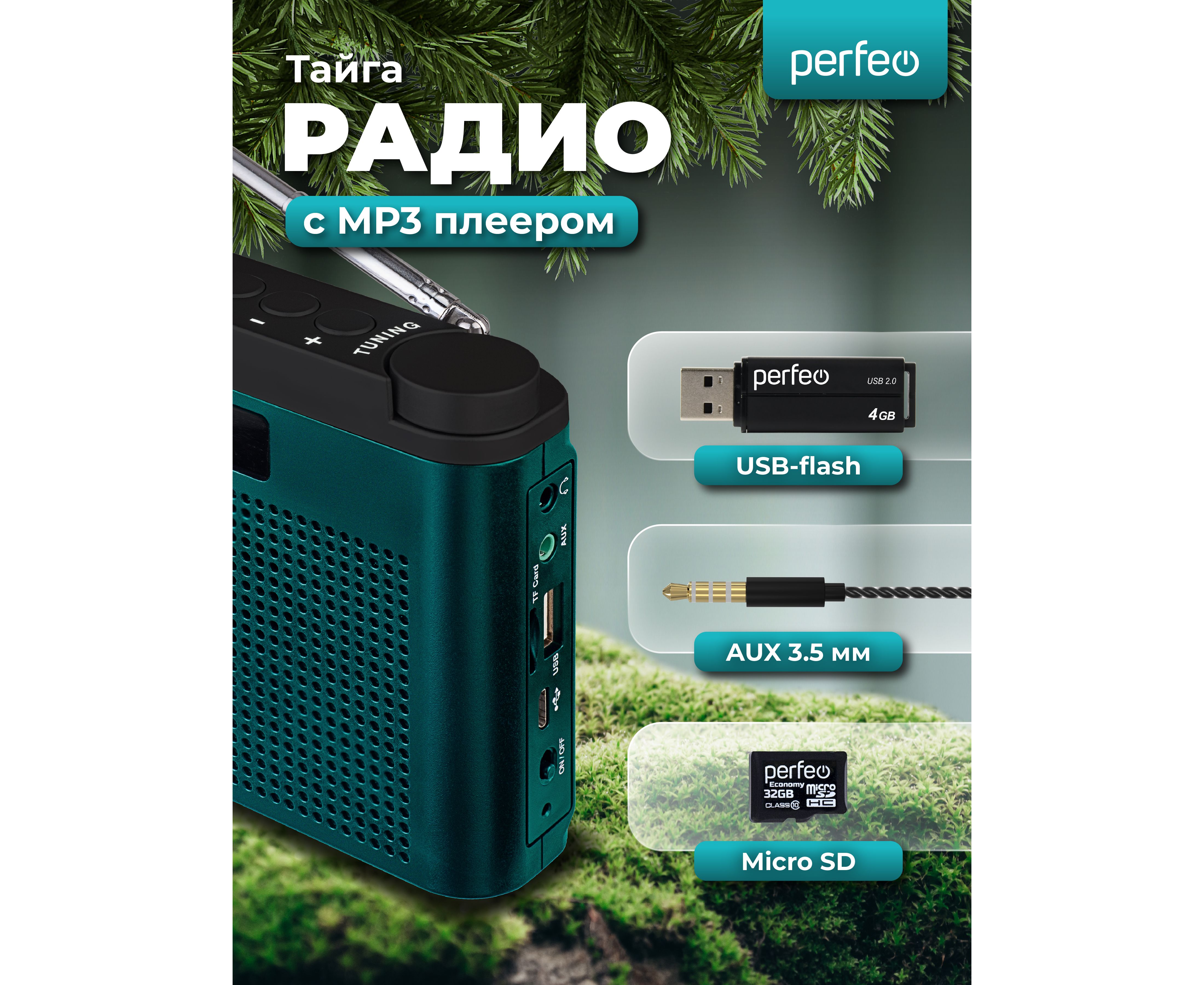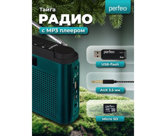 Портативный радиоприёмник УКВ/FM с разъемами USB и microSD. Perfeo "Тайга" создан на базе уже проверенного тюнера модели Perfeo SV922. Радиоприемник в классическом корпусе имеет стильный внешний вид, удобное колесико-регулятор радиоволны и кнопки управления на верхней грани устройства. Поворотная телескопическая антенна принимает сигнал в 2-х самых популярных диапазонах (УКВ и FM), также предусмотрена возможность выборочного запоминания 10 станций. Есть встроенный MP3-плеер, который воспроизводит MP3-файлы с карты памяти microSD или USB-накопителя. Аудиовход AUX, разъем для наушников и поддержка режима USB-аудио расширяют функционал приемника. За насыщенное звучание приемника и создание эффекта глубины звуковой сцены отвечают два активных 40мм динамика (RMS 6 Вт) и пассивный сабвуфер Bass Booster. Автономная работа осуществляется от встроенного аккумулятора 18650 (1800 мАч), зарядка от USB-порта (кабель mini USB - USB в комплекте). Радиоприемник от сети может работать через USB-адаптера (приобретается отдельно), варианты адаптеров приведены на фото к товару. В нашем ассортименте магазина Perfeo есть множество портативных радиоприемников, они станут отличным подарком для родителей, дедушек и бабушек, подарят хорошее настроение и станут украшением вашего интерьера, прекрасно впишутся в любой дизайн, как дома, так и на даче, незаменимы в походе. Радиоприемник легко зарядить от повербанка, он не прихотлив в использовании.