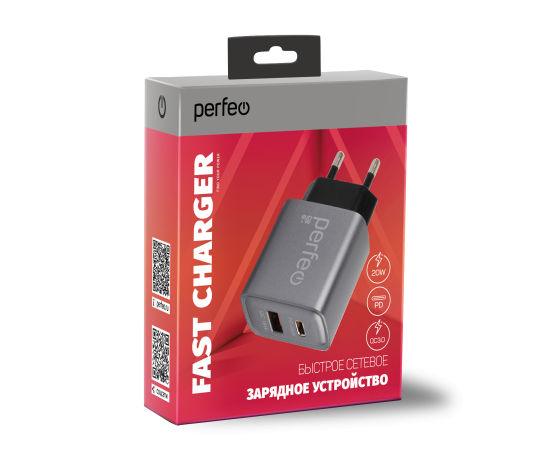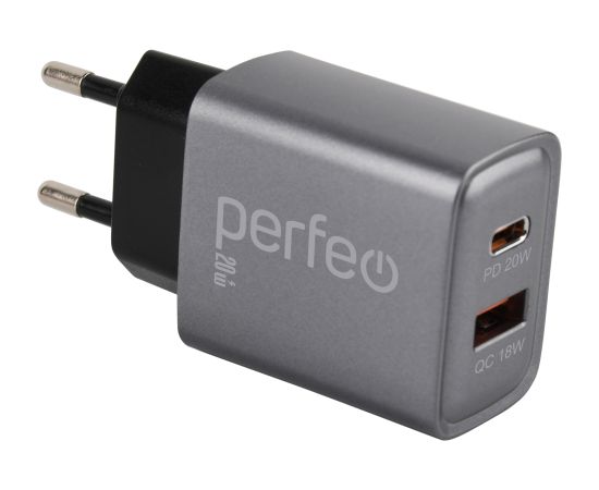 Сетевое зарядное устройство PERFEO с двумя разъемами USB-A+TYPE-C, 20W, серый (I4669)