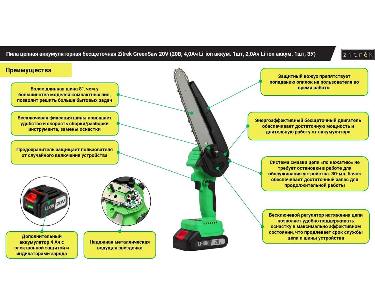 Пила цепная аккумуляторная бесщеточная Zitrek GreenSaw 20V 082-1858-1 (аккум. 1шт, ЗУ)