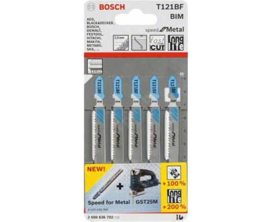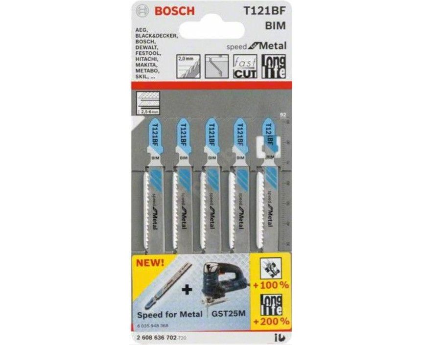 Набор пильных полотен Bosch T121BF Speed for Metal 5шт (2.608.636.702) (для всех лобзиков с T-образным хвостовиком, позволяет выполнять быстрые прямые пропилы в металле, форма обратного конуса, общая длина: 92 мм, шаг зубьев: 2,0 мм, материал: BIM)