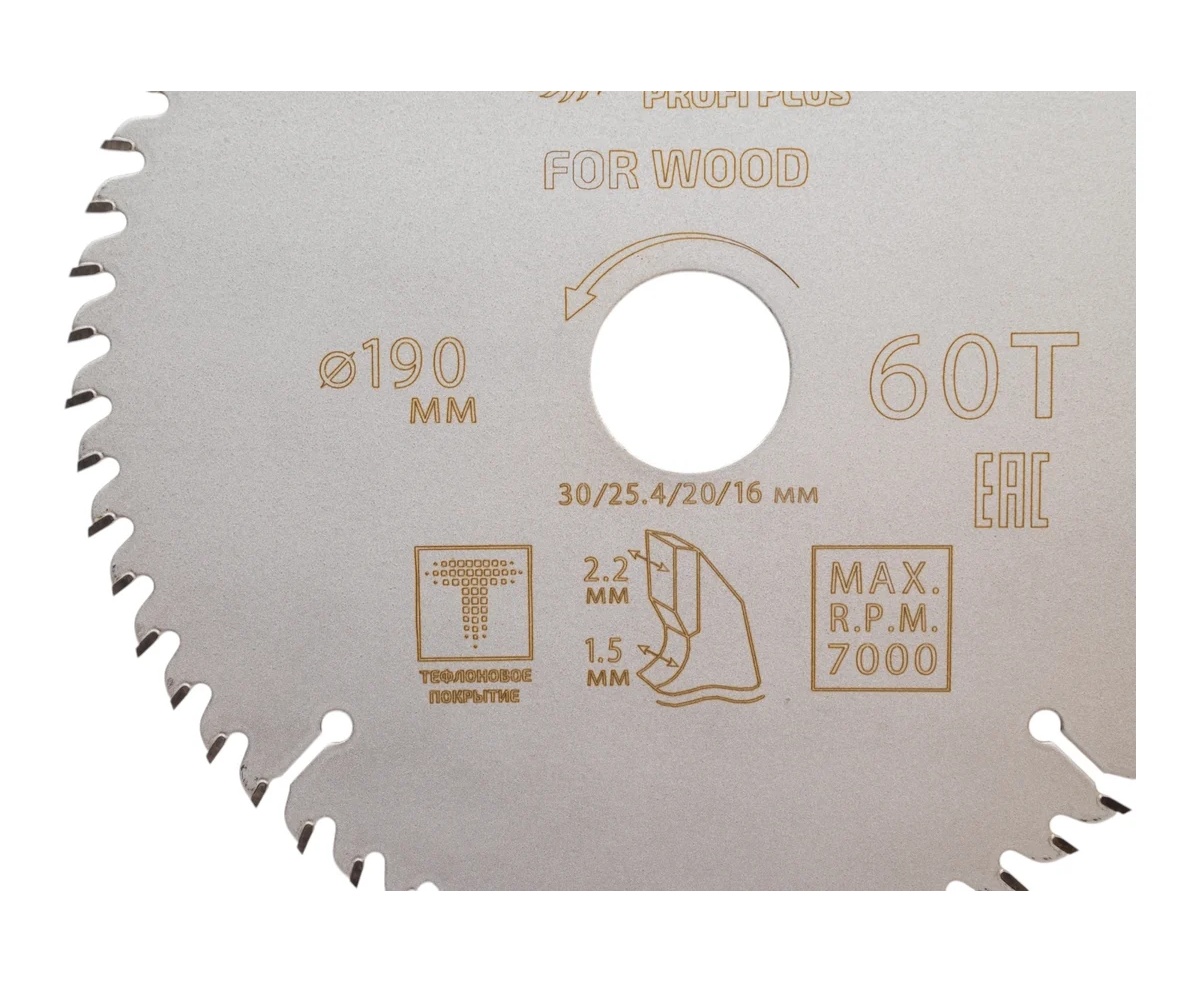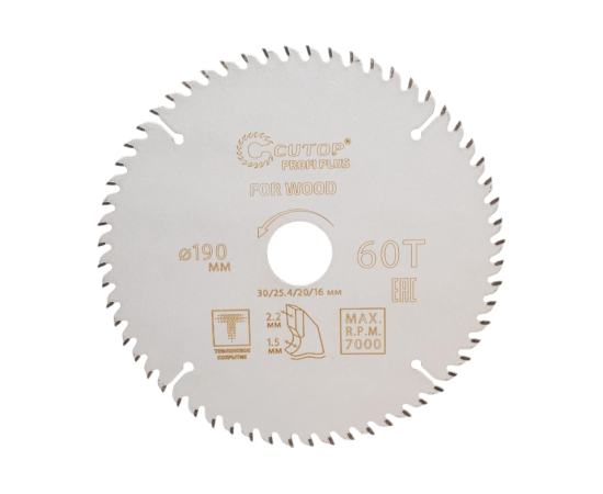 Диск пильный с тефлоновым покрытием по дереву Profi plus 190x1.5/2.2x30/25.4/20/16 мм, 60Т CUTOP 75-19060Т используется совместно с циркулярными и торцовочными пилами для продольного и поперечного реза. Предназначен для распила мягких и твердых пород древесины, МДФ, фанеры.