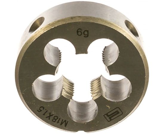 Плашка М18х1.5 мм СИБРТЕХ 77048 широко используется в слесарных мастерских и производственных цехах для нарезания внешней резьбы. Изделие выполнено из инструментальной стали, выдерживает высокие нагрузки. Режущие кромки обладают твердостью 60 HRc, что полностью соответствует требованиям ГОСТа (60–62 HRc).