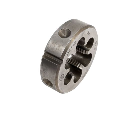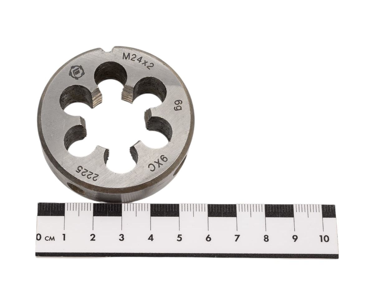Плашка М 24 х2 9ХС ТМ Туламаш 57928 разработана для крупной резьбы. Изделие представляет собой прочный инструмент с добавлением в сталь хрома и углерода.