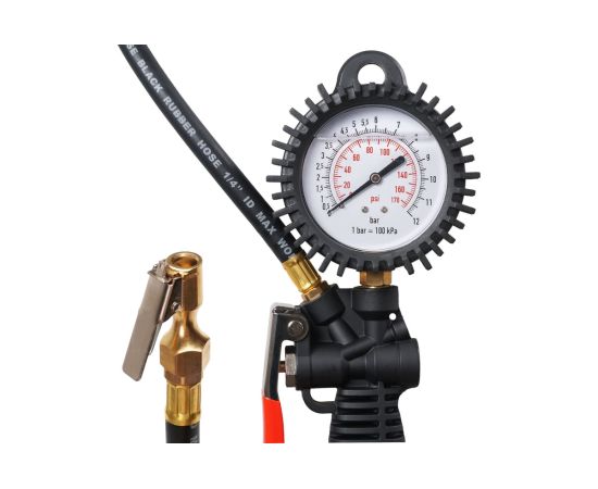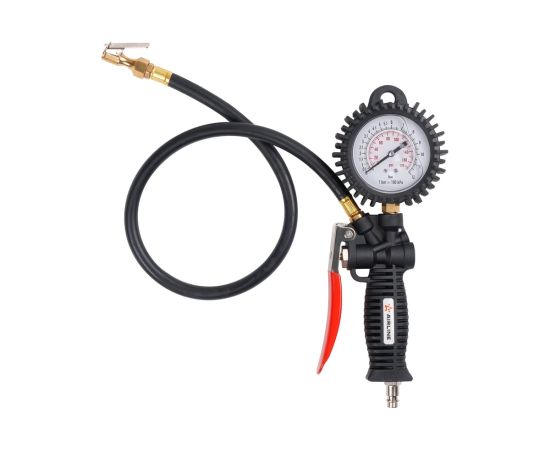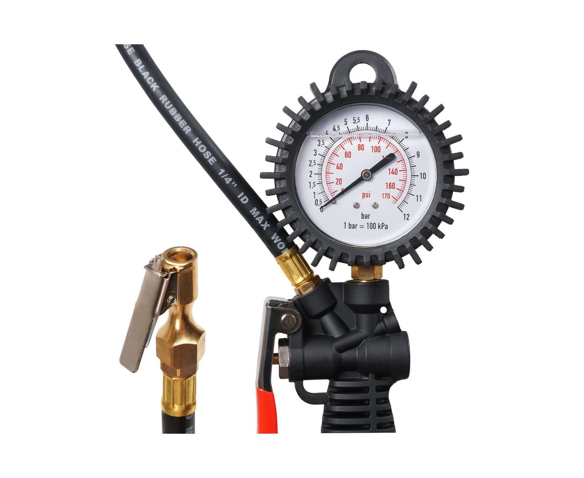 Пистолет для накачки шин с манометром 12 АТМ INDUSTRY AIRLINE ATBU040, корпус которого изготовлен из нейлона. Манометр защищён резиновым чехлом. Гибкий шланг имеет быстросъёмный наконечник. Конструкцией предусмотрена функция для сброса лишнего давления. В комплект входит присоединительный фитинг 1/4".