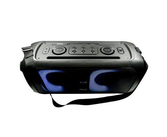 Управление - на верхней панели: выключатель питания, режим подсветки/цветомузыки, следующая запись/радиостанция, предыдущая запись/радиостанция, воспроизведение/пауза/поиск радиостанциий, выбор режима (источника звука). Регуляторы: громкость общая, громкость микрофона