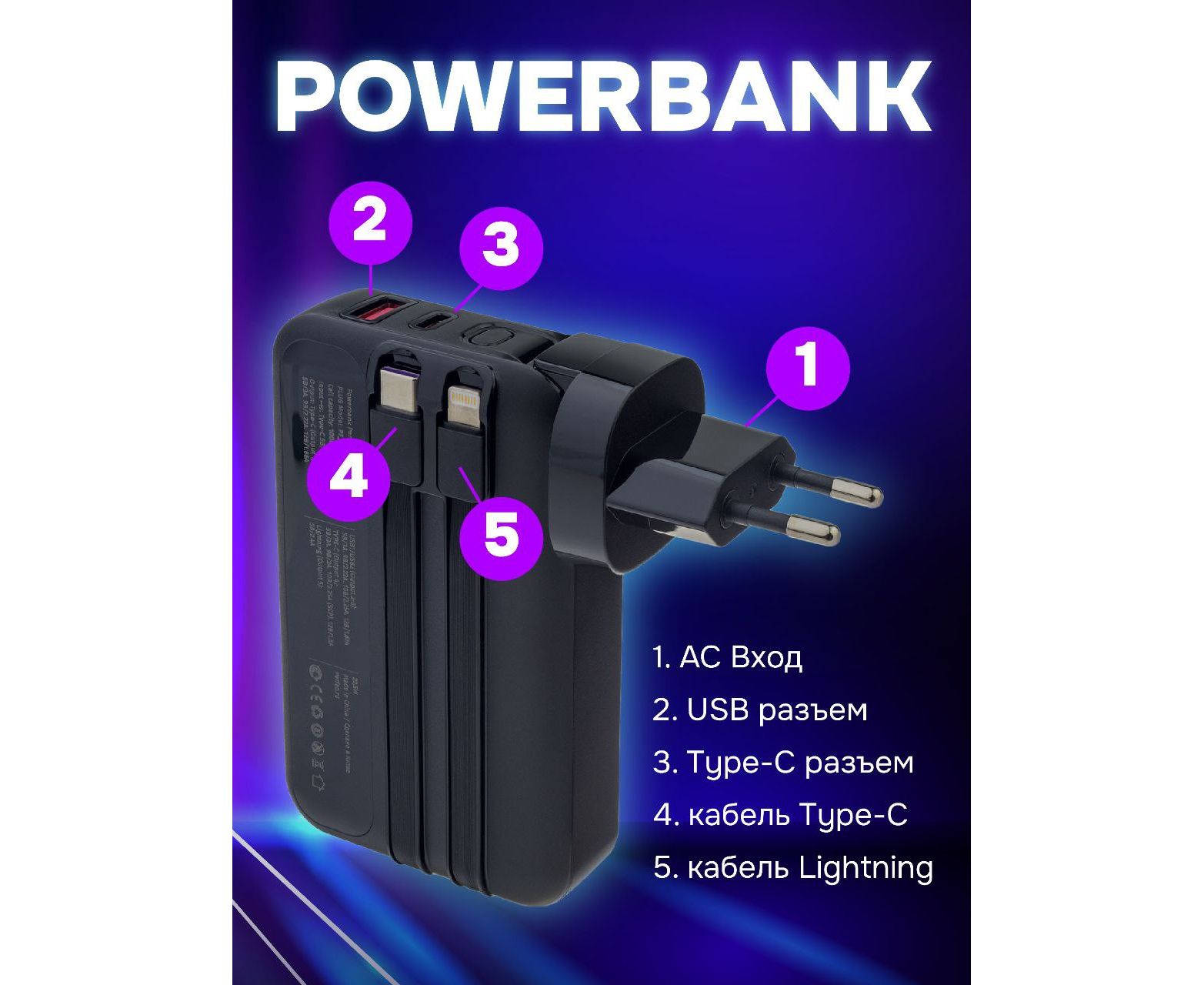 Заряд устройства вход Type-C (Input) - 5 В/3А. 9 В/2А. 12 В/1.5А.