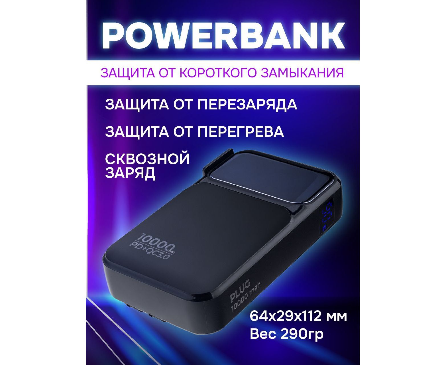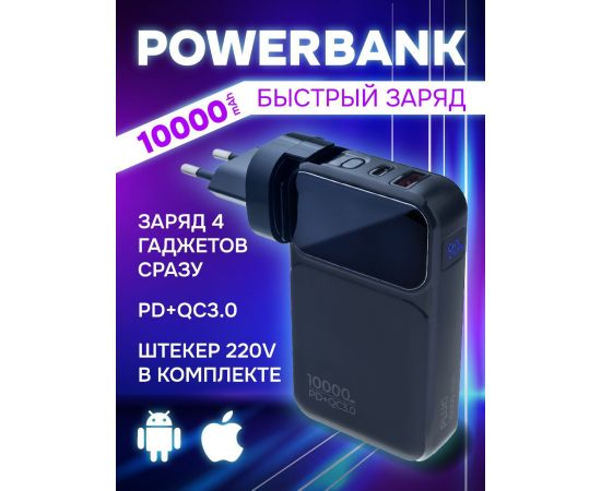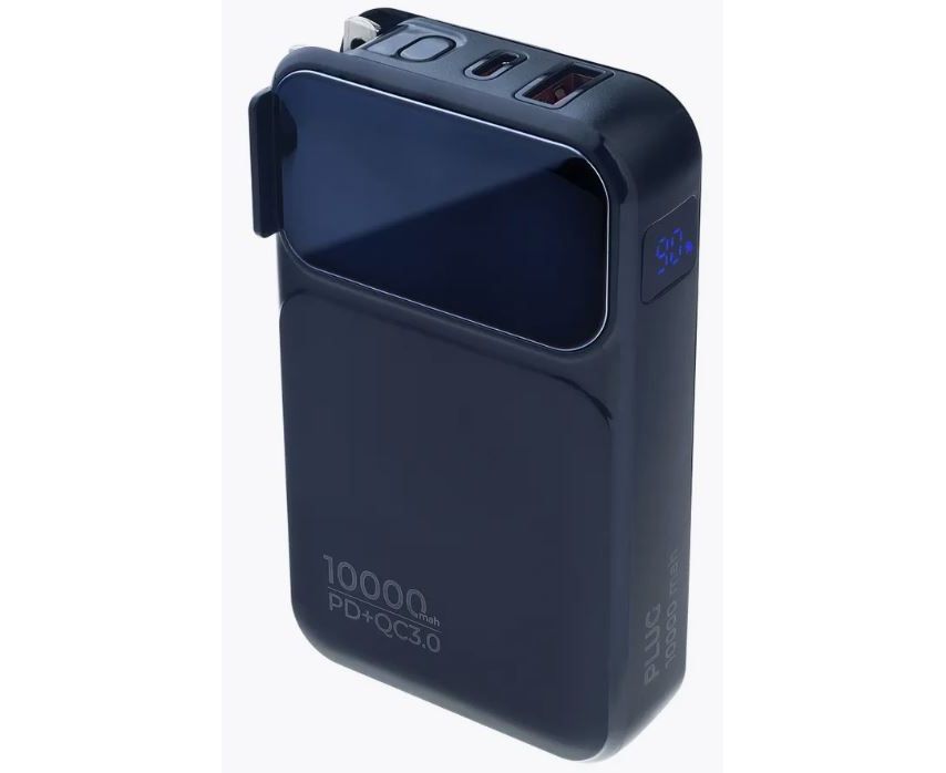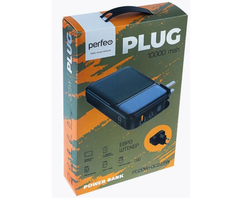 Распродажа! Пауэрбанка Perfeo PLUG 10000 mAh/LED дисплей/Вход 230V/PD+QC 3.0/Выход: 5A, max 22.5W/ цвет - черный
