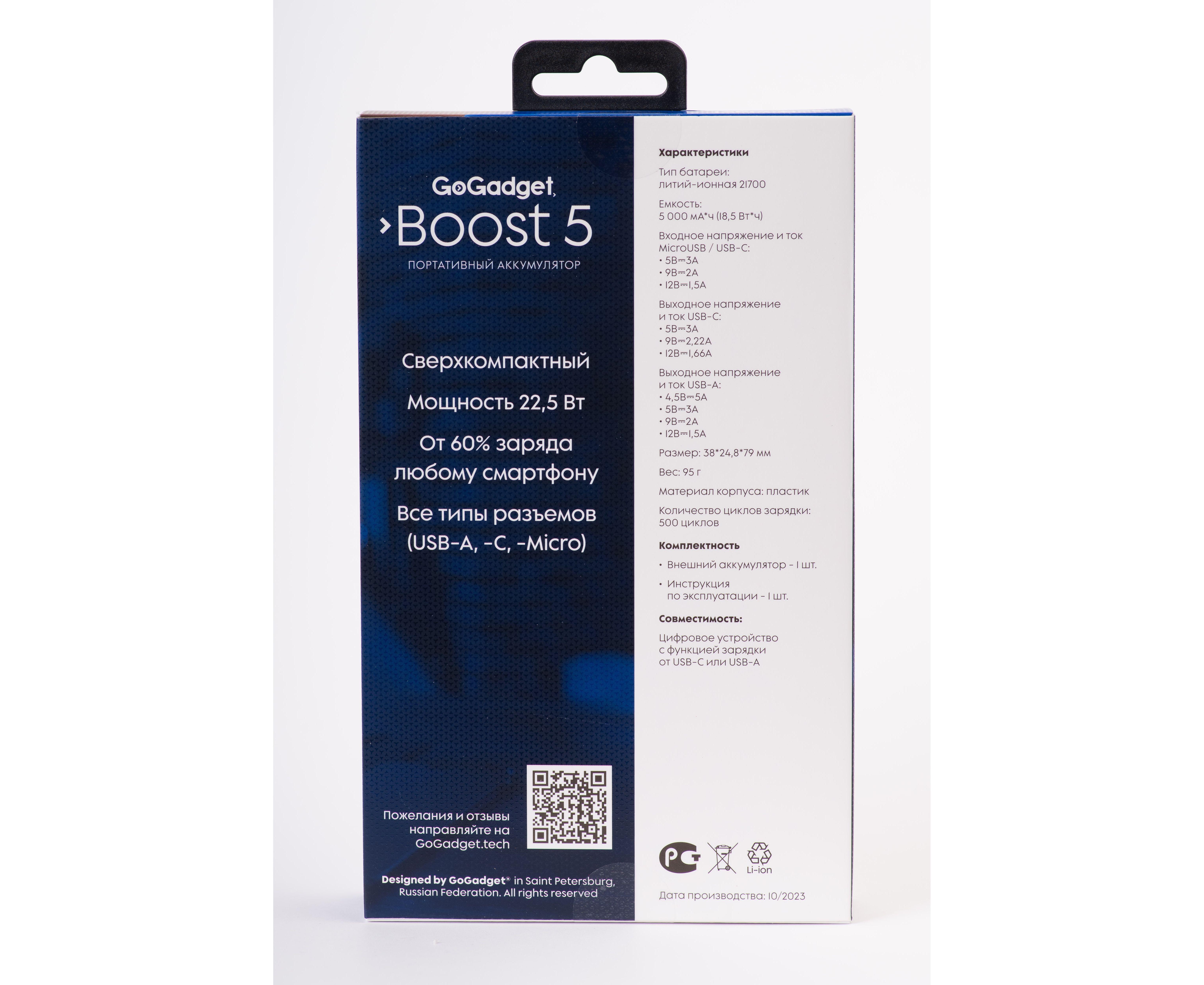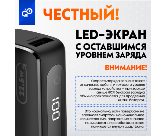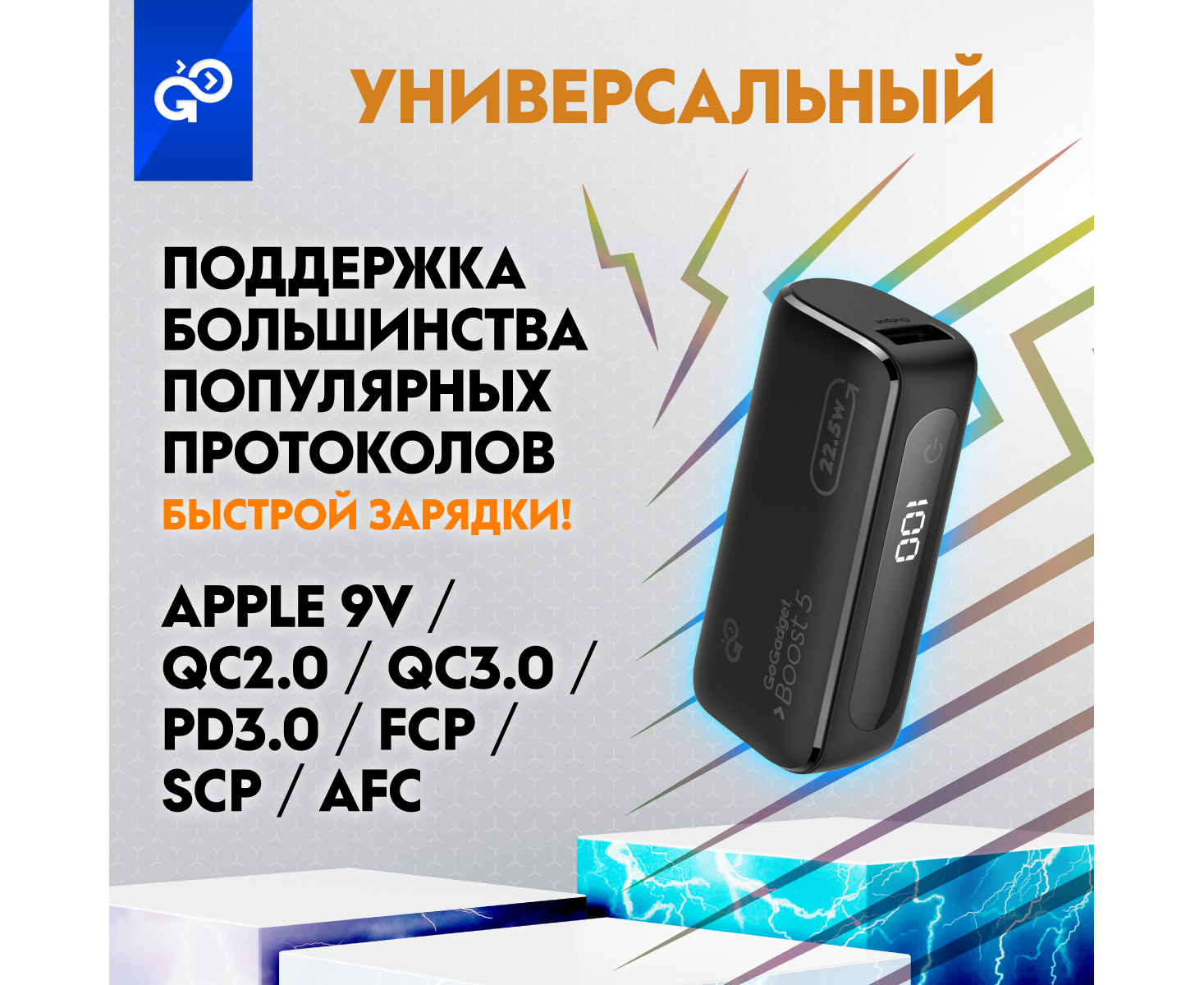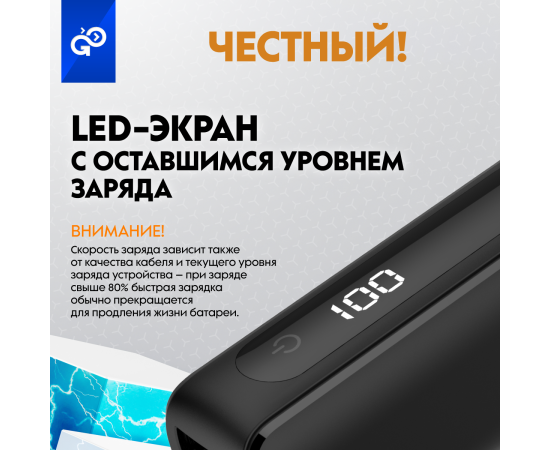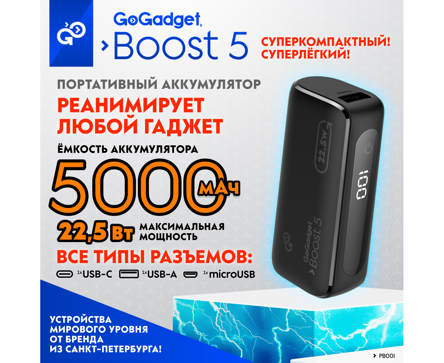 Портативный аккумулятор GoGadget Boost 5 22,5 Вт 5000 мАч 1x USB-C, 1x USB-A, 1x microUSB, ЧЕРНЫЙ