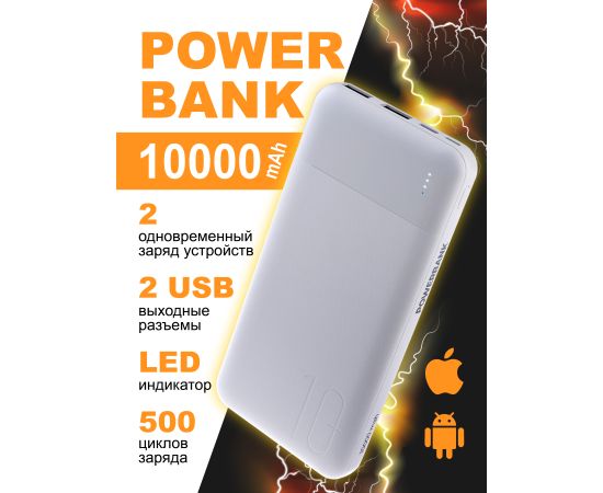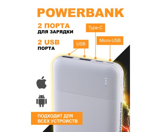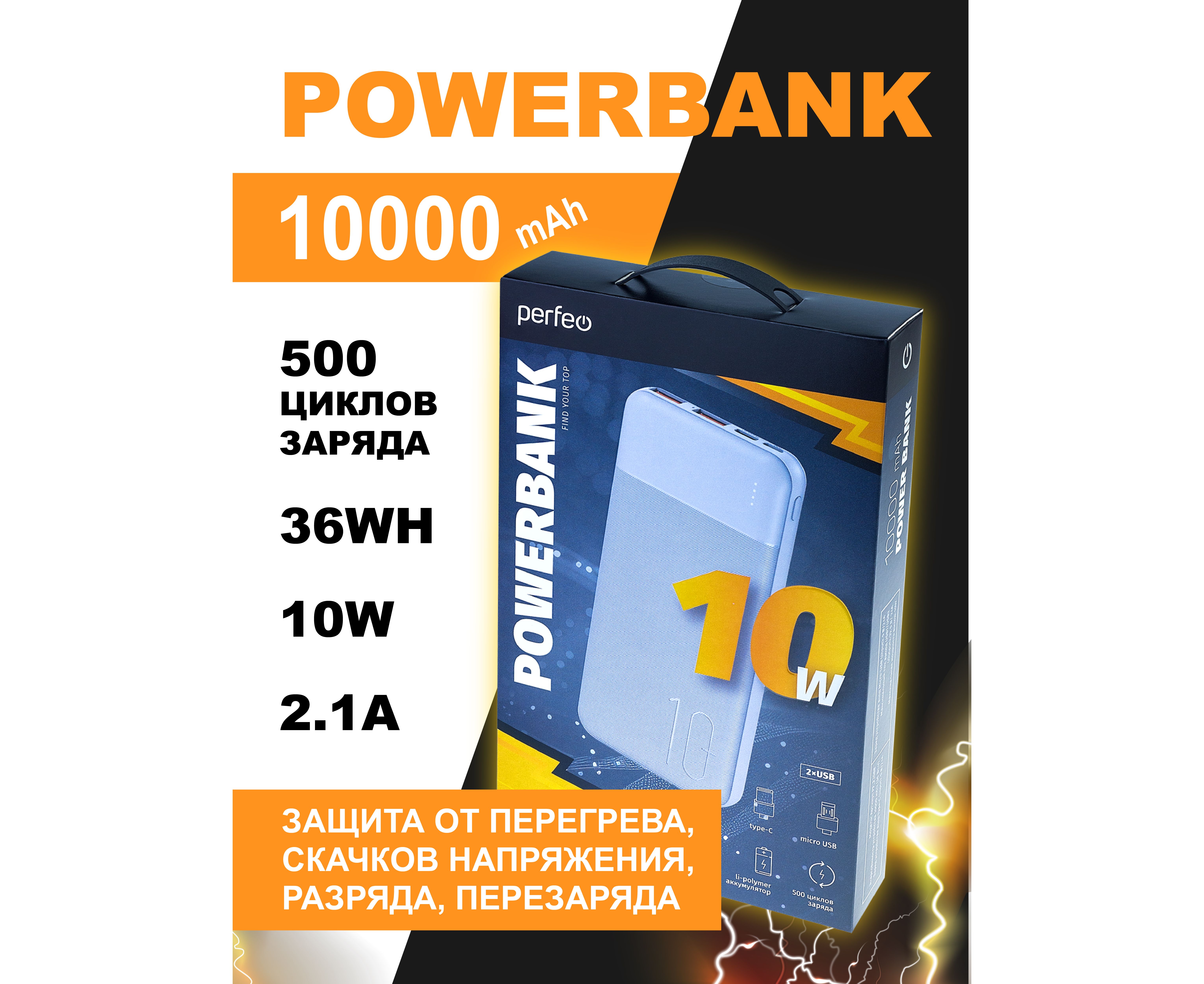 Повербанк Perfeo 10000 mah + In Micro usb+Type-C /Out USB 1 А, 2.1A / Белый